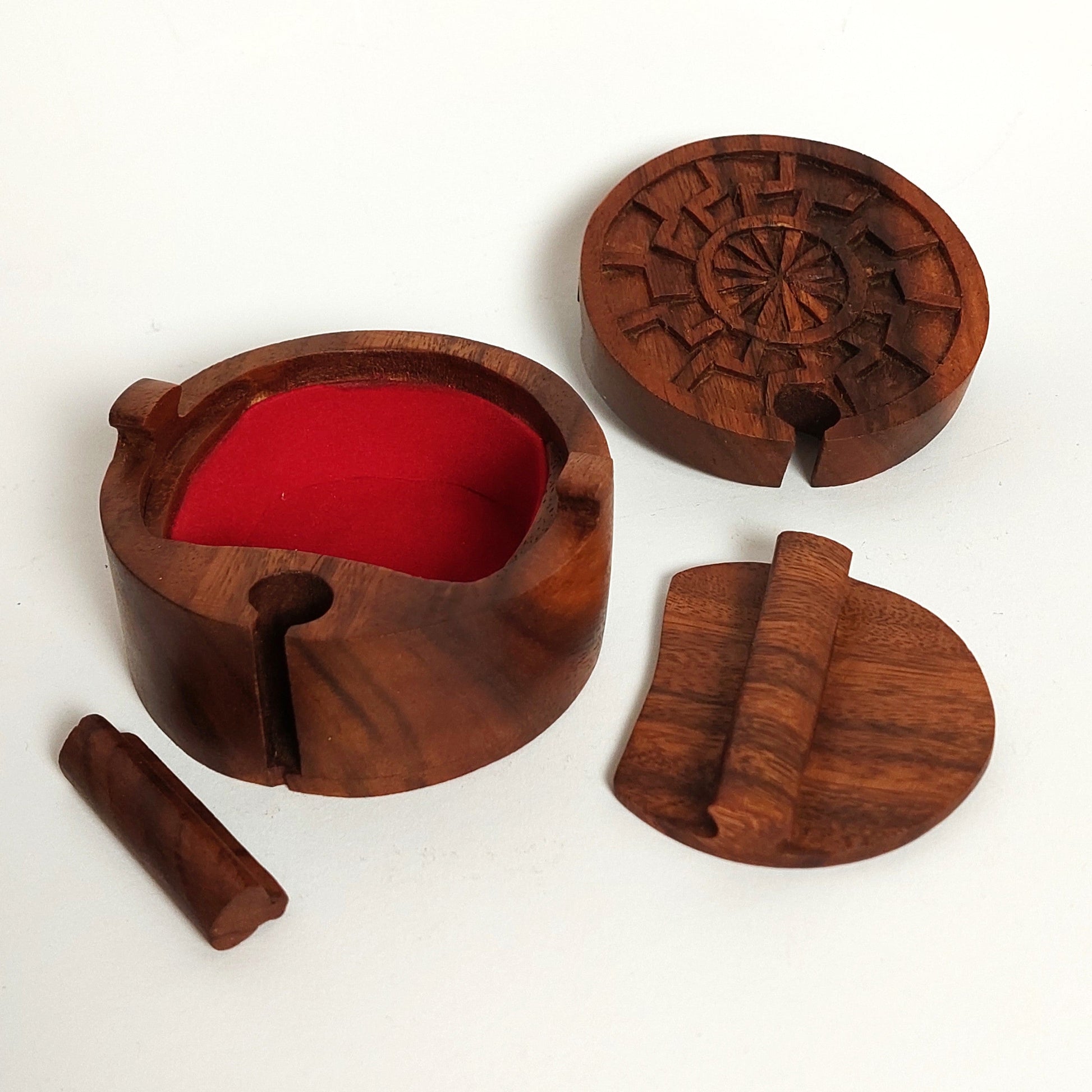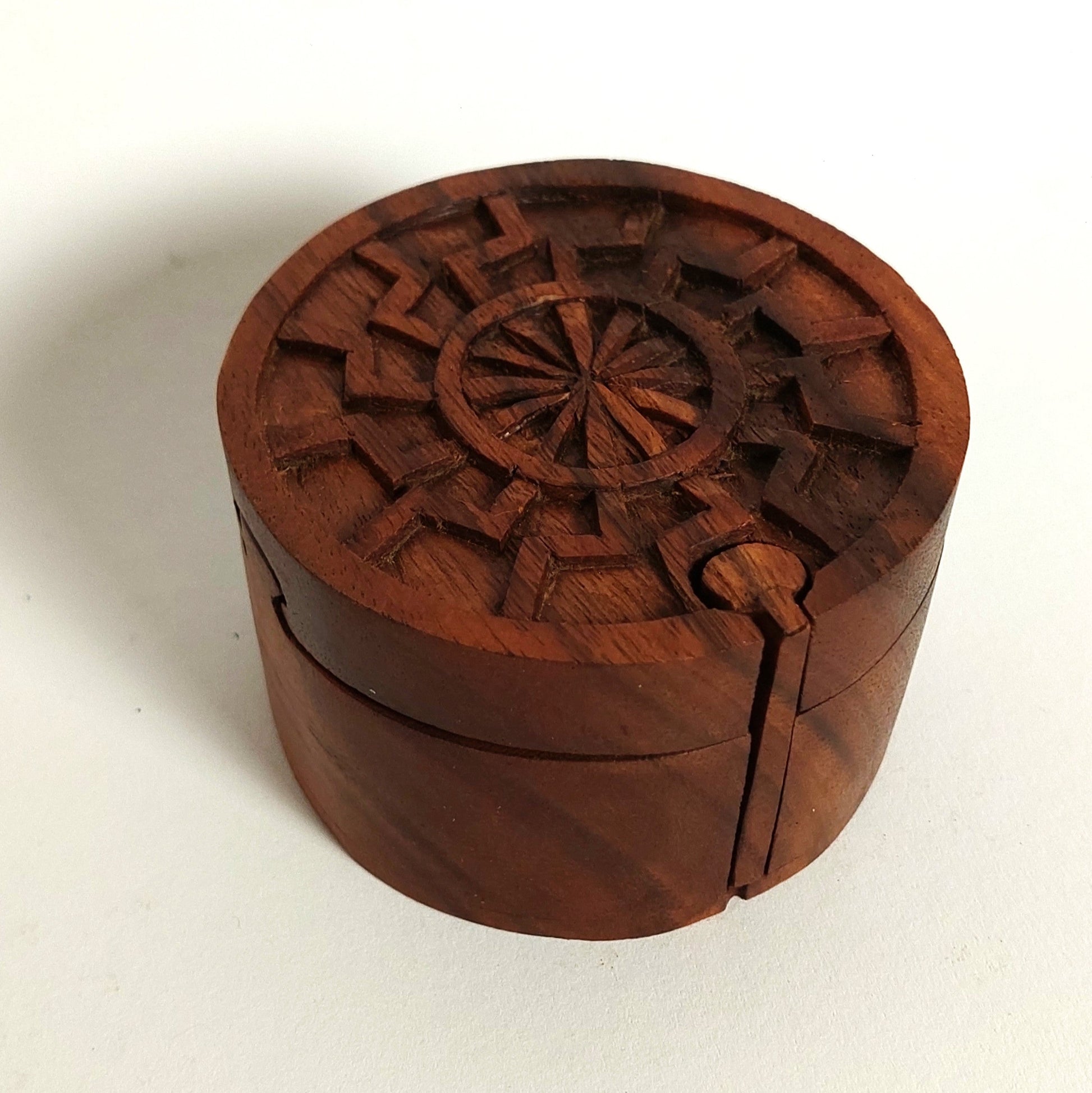 Mit Sonnenrad verzierte Wikinger-Schmuckdose aus Holz