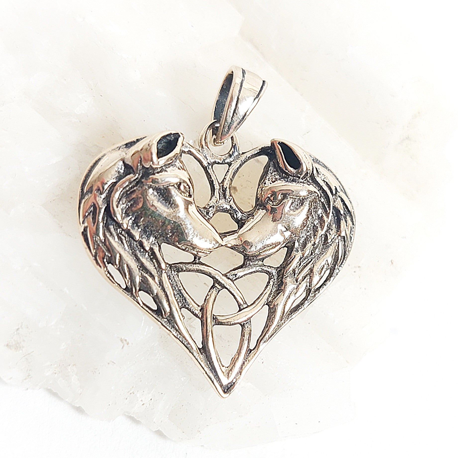 Das Wolfsherz verbindet die Intelligenz des Wolfes mit leidenschaftlicher Emotion und treuer Partnerschaft. Die beiden Wolfsköpfe sind in eleganter Herzform mit Triskelsymbolik als Zeichen der Verbundenheit zueinander gewendet.
